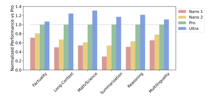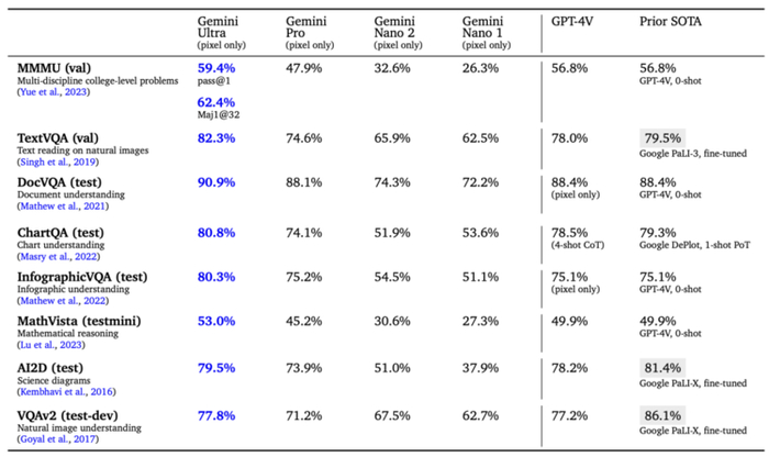 2. Gemini Pro的性能类似于GPT-3.5,而Gemini Ultra据说优于GPT-4。Nano-1(1.8B 参数)和 Nano-2(3.25B 参数)设计为在终端设备上运行。