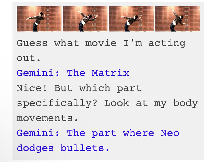 根据技术报告,Gemini Ultra模型是在YouTube数据上进行深度训练的,因此它可以从视频(《黑客帝国》)中的一个场景推断出一系列静态图像,并从中写出文字叙述。