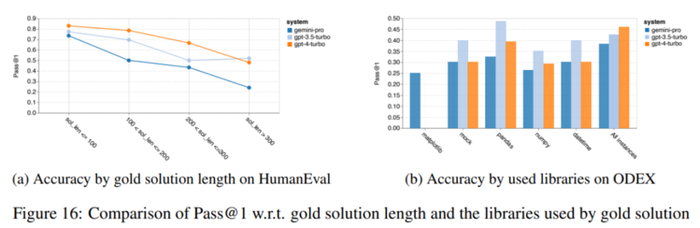 作者还在图 16 (b) 中分析了每个解所需的库对模型性能的影响。在大多数库用例中,如 mock、pandas、numpy 和 datetime,Gemini Pro 的性能比 GPT 3.5 差。不过,在 matplotlib 的用例中,它的性能要优于 GPT 3.5 和 GPT 4,这表明它在通过代码执行绘图可视化时具有更强的能力。