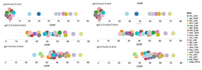 仔细观察图 19 可以发现,Gemini Pro 在置信度较高的无屏蔽样本中略微优于 GPT 3.5 Turbo 和 GPT 4 Turbo。具体来说,它在 5-shot 和 0-shot 设置下分别比 GPT 4 Turbo 多出 1.6 chrf 和 2.6 chrf,比 GPT 3.5 Turbo 多出 2.7 chrf 和 2 chrf。不过,作者对 GPT 4 Turbo 和 GPT 3.5 Turbo 在这些样本上的性能进行的初步分析表明,这些样本的翻译通常更具挑战性。Gemini Pro 在这些特定样本上表现不佳,尤其明显的是,Gemini Pro 0-shot 会屏蔽响应,而 5-shot 则不会,反之亦然。