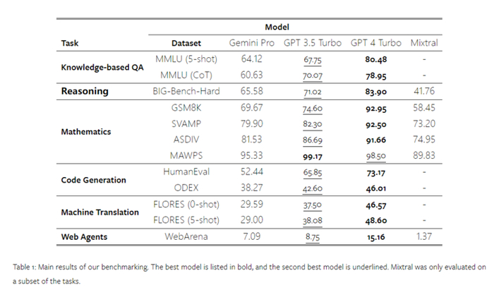 他们在十个数据集上测试了 Gemini Pro、GPT 3.5 Turbo、GPT 4 Turbo、Mixtral 的文本理解和生成能力。具体来说,他们在 MMLU 上测试了模型回答基于知识的问题的能力,在 BigBenchHard 上测试了模型的推理能力,在 GSM8K 等数据集中测试了模型解答数学问题的能力,在 FLORES 等数据集中测试了模型的翻译能力;在 HumanEval 等数据集中测试了模型的代码生成能力;在 WebArena 中测试了模型作为遵循指令的智能体的能力。