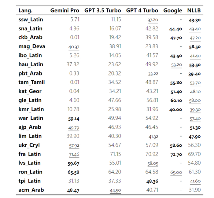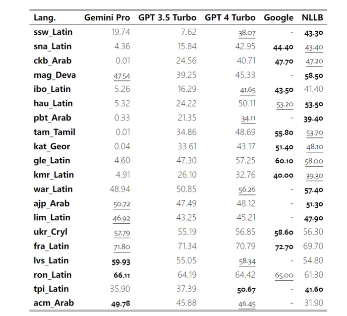在表 4 和表 5 中,作者对 Gemini Pro、GPT 3.5 Turbo 和 GPT 4 Turbo 与谷歌翻译等成熟系统进行了比较分析。此外,他们还对 NLLB-MoE 进行了基准测试,NLLB-MoE 是领先的开源机器翻译模型,以其广泛的语种覆盖而著称。结果表明,谷歌翻译总体上优于其他模型,在 9 种语言上表现出色;其次是 NLLB,在 0/5-shot 设置下,在 6 种 / 8 种语言上表现出色。通用语言模型显示出具有竞争力的性能,但在翻译成非英语语言方面尚未超越专用机器翻译系统。