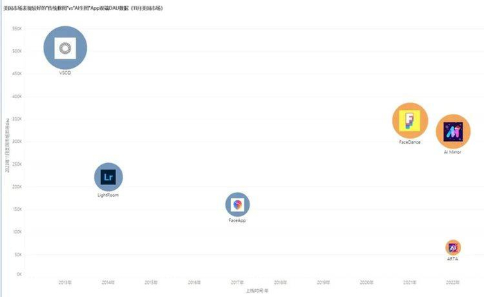 在 2022 年左右上线的 AI 生图 App 们,在美国市场的 DAU 量级已经能与头部修图 App 抗衡 | 白鲸出海根据点点数据制图(蓝色背景为传统修图,黄色背景为 AI 生图)