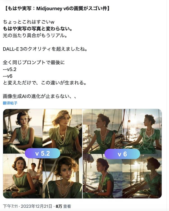 如今,因为Midjourney V6生成的图片过于逼真,同样的女性面部主体,V6在皮肤细节、毛发细节、光影效果上,都远优于V5.2的效果,甚至已经几乎分辨不出来到底是实拍还是出自AI,所以引发了更多人对于AIGC技术的讨论。