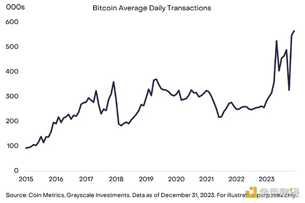 比特币也面临着围绕Ordinals兴起的类似争论,Ordinals是最古老、最大的公共区块链上的一种数字收藏品。 我们将比特币的核心用例视为一种“价值存储”资产和黄金的数字替代品,但由于采用趋势和/或技术发展,其应用可能会随着时间的推移而扩展。 12 月,比特币区块链的交易数量创下历史新高,这主要是由于Ordinals和相关资产的交易(图表 4)。我们认为,Ordinals交易的增长应该被视为对比特币估值的积极影响,因为它扩大了区块链的潜在市场。