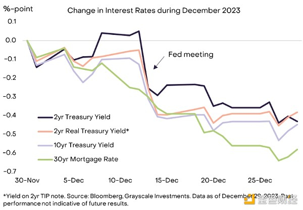 与黄金一样,比特币是一种与美元竞争的替代货币体系。 因此,导致美元竞争力恶化的基本面变化(包括实际利率下降)可能对比特币有利。 我们认为,美联储 12 月会议上有关可能降息的指导导致实际利率下降和美元疲软,并可能支撑比特币的估值。