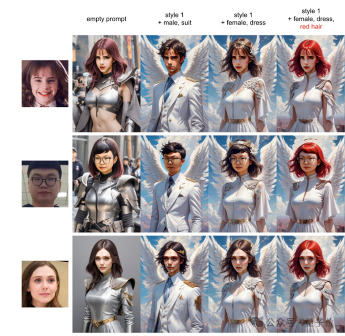 三是除了实现更好的面部保真度,也保留了文本可编辑性。如下图所示,只需几个字,即可让形象变性别、换套装、改发型以及发色。
