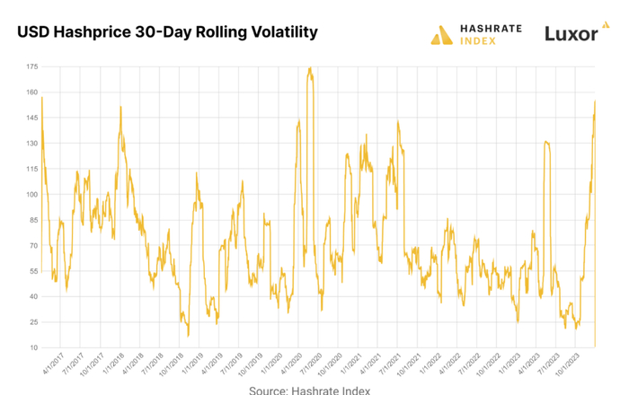 主要是由于铭文引起的交易费用波动,相比于 2022 年,算力价格在 2023 波动性更大。