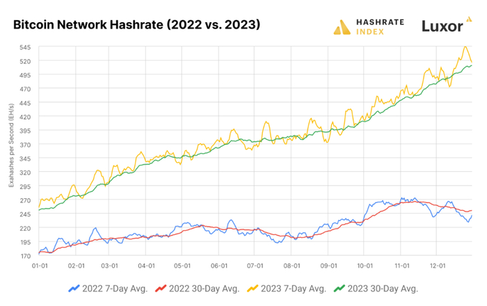 2023 年,比特币算力经历了爆炸性的增长。其 7 天平均算力值从 255 EH/s 增长到 516 EH/s,增幅达到 102%,这远远超过了 2021 年和 2022 年时 18% 和 41% 的涨幅。2023 年比特币 7 天平均算力的平均值为 382 EH/s,比 2022 年时的 220 EH/s 增长了 73%。此外,2023 年比特币算力 7 天平均值和 30 天平均值均达到了历史最高水平,分别为 545 EH/s 和 510 EH/s。