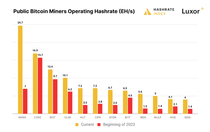 2023 年是大多数上市矿企实行扩张的一年。在我们追踪的 12 家矿企中,有 7 家在全年内将其算力增加了一倍以上。Marathon 增长最为迅速,其算力从 7 EH/s 扩展到 24.7 EH/s。