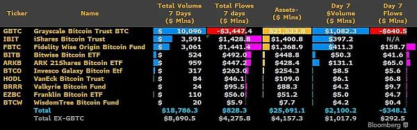 尤其是截至 1 月 23 日,所有现货比特币 ETF 的前 7 个交易日总成交量约 190 亿美元,而 GBTC 就占比过半,这也意味着目前 ETF 所带来的增量资金,整体仍处于对冲 GBTC 持续资金流出的阶段抛压。