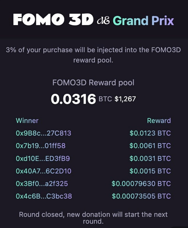 个人推测,若 Comingchat 在 Donut 上发布铭文,由于有固定 3% 的资金自动进入 FOMO3D 池,Comintchat 的奖池很有可能突破 1 BTC,这个奖池给最后 6 个参与的用户分配,分配比例是:50%,25%,12.5%,6.25%,3.25%,3% 。