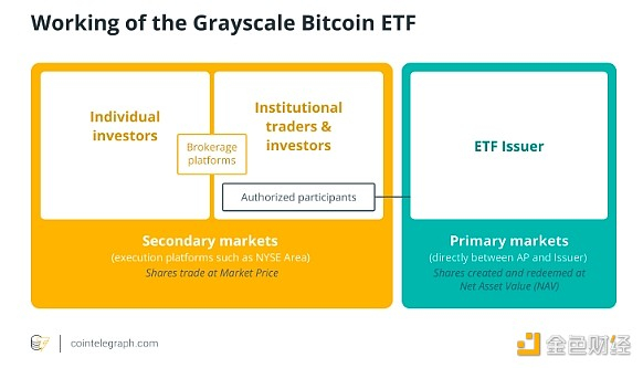 希望投资GBTC的授权合作伙伴可以通过Grayscale在一级加密市场上购买比特币,并发行相应数量的GBTC股份来获取资金。这些股份然后可以在股市上出售给零售投资者。