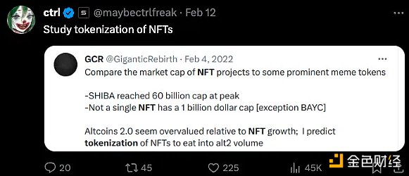@Ctrl 认为,通过使 NFT 具有同质化,由于资本流动的增加,NFT 收藏品的估值(顶级约 10 亿美元)可以更接近顶级模因币(600亿美元)的估值。