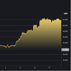 2月正值花团锦簇的中国新年,比特币似乎也追上了这股祝福之风。春节期间,比特币迎来大涨,2月9日,比特币涨至47000美元,2 月 11 日,突破 48,000 美元,2月14日,比特币突破5万美元,并一度追高至 52,700美元,后持续在51000美元振荡.