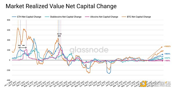 追踪加密资产表现的另一个视角是使用每个类别的上限市值,该市值汇总了链上转移的所有加密货币的成本基础价值。从这个角度来看,我们可以更好地评估数字资产市场内资金的流动情况: