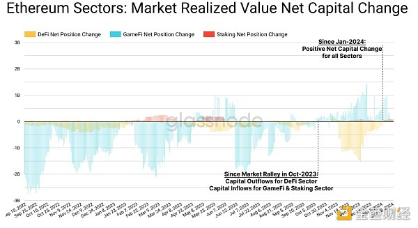 在以太坊生态系统内,我们可以确定三个主要类别:DeFi、GameFi和Staking。自今年年初以来,这三个类别都有资金流入,但是DeFi和GameFi在2022年和2023年期间一直出现了相对较大的资金流出。