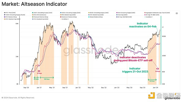 我们的山寨币指标自去年十月以来一直显示出正向动量,但在比特币ETF上线后的卖消息事件中短暂暂停。它于2月4日重新触发。