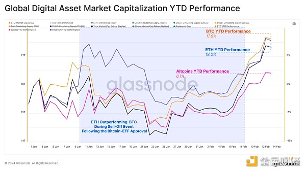 就资产表现而言,BTC和ETH位居前列,年初至今的涨幅分别为+17.6%和+18.2%。我们注意到,在比特币ETF获批后,ETH开始表现出超过BTC的趋势,这与2023年的相对表现不足形成了对比。
