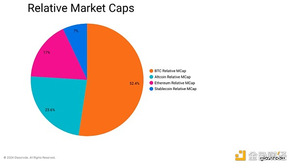 就市值主导地位而言,比特币继续领先,占数字资产总市值的 52% 以上。 相比之下,ETH 占 17%,稳定币占 7%,山寨币领域的其余币种占 24%。