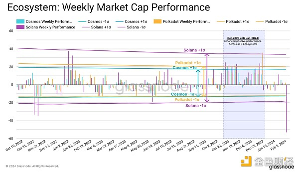 在这里,我们比较了每个生态系统中前几个代币的总市值在每周变化。在过去的18个月中,Solana表现出了相对较高的波动性,其正向表现非常突出。Polkadot和Cosmos的波动性类似,但Polkadot生态系统的表现优于后者。