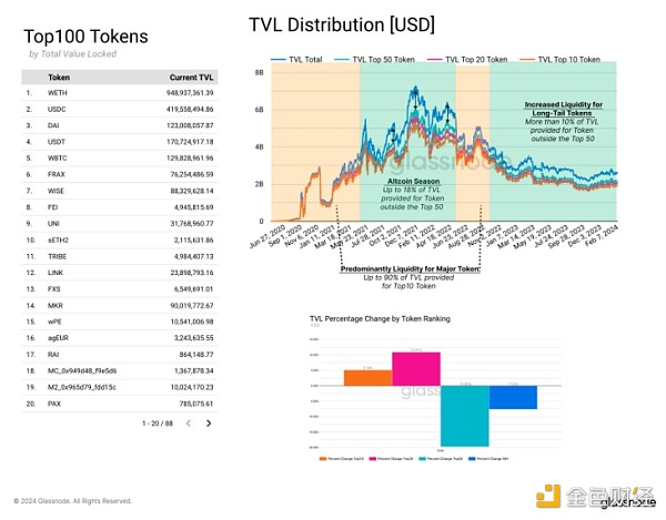 通过观察每个代币类别的TVL百分比变化,我们可以发现Top 10(5.14%)和Top 20(10.9%)代币提供的流动性增加,而排名20至50的代币的流动性已经减少。这表明市场对长尾资产的兴趣尚未显著增加。
