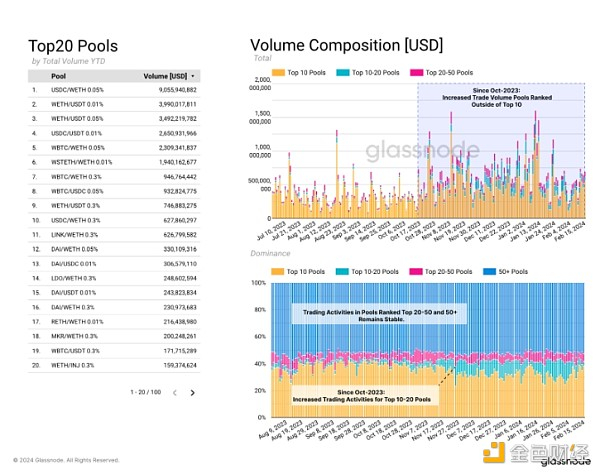 现在,我们将其与交易者的行为进行对比,我们可以观察到自 2023 年 10 月以来 Uniswap 上的交易量有所增加,其中包括前 10 名之外的代币。前 10 至 20 名代币对的交易活动也在增加。