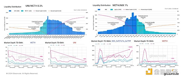 山寨币和 WETH 储备之间的分布均衡,整体预期上行波动性略高。 这表明流动性提供者普遍看好这些代币的前景。 GameFi 代币 IMX 是个例外。