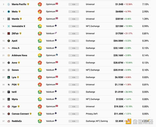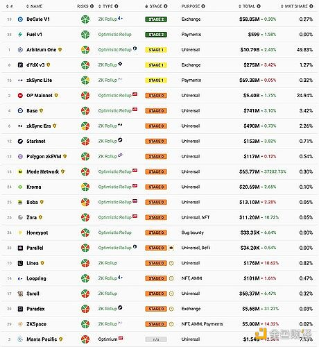 我们借用L2Beat上展示的信息,来梳理一下此时此刻的巨大挑战。下面的截图展示了L2Beat上当前正在运行的全部38个L2项目,以“STAGE”的标准评价从高到低排序。