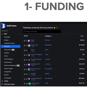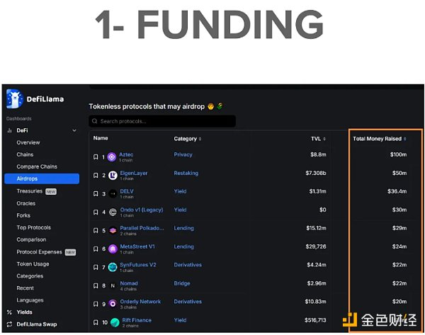 DefiLlama 有一个很棒的工具,它列出了所有可能空投的无代币协议。然后,你可以按“筹集的资金总额”进行过滤。