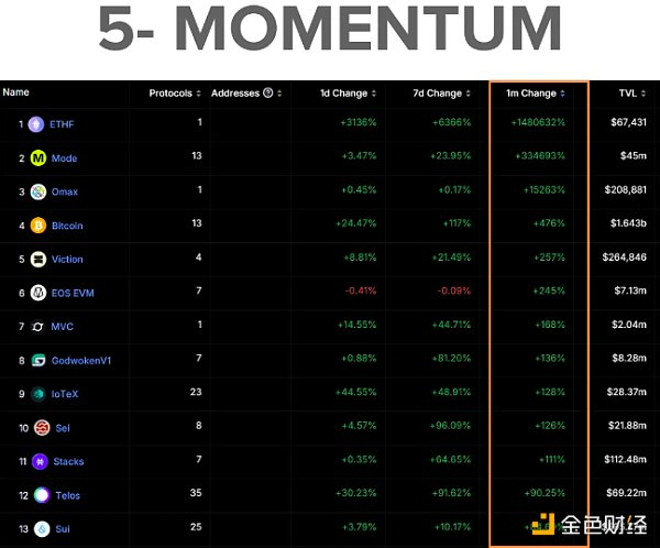 在 DefiLlama → DeFi → Chains → Sort 1m Change 上查看 TVL 流入。