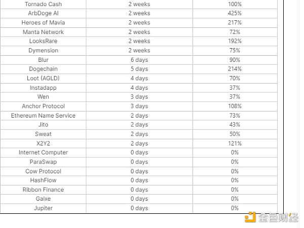 截至 2024 年 2 月 20 日,50 个最大空投达到历史最高代币价格所需的天数、周数或年数,以及相应的峰值价格回报百分比: