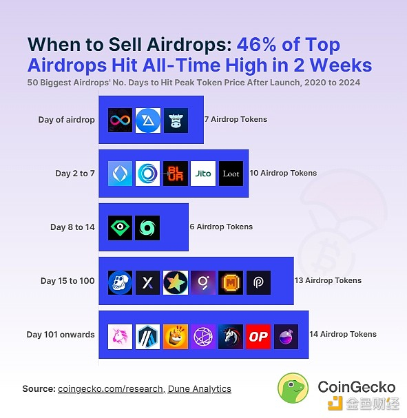 在 50 个最大的空投中,有 23 个 (46%) 在空投日期的前两周内录得代币价格峰值。 这表明,出售空投代币的最佳时间可能是在收到空投代币后的 14 天内,以获得最大利润。
