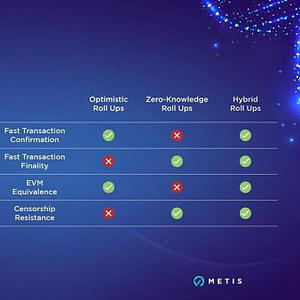 但与其他L2不同的是,Metis 采用了创新的 Hybrid Rollups 技术,结合了两种主流的区块链扩容方案:Optimistic Rollup(OP Rollup)和 Zero-Knowledge Proofs Rollup (ZKPs Rollup)。