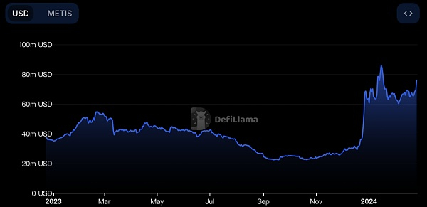 Metis目前的TVL是$82.82M,从上述Metis TVL自2023年起的变化中,我们可以看出自从2024Metis推出去中心化排序器的设计后,链上TVL有了显著的增长,证明了社区和市场对于这一方向的看好。