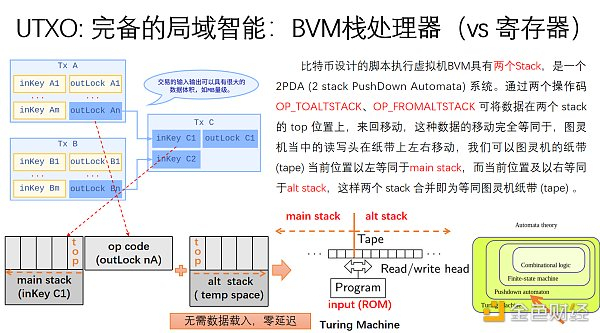 在TBC的UTXO模型下,每个UTXO链都是一个图灵机,大量的并发的图灵机组成了区块链的实用的智能完备的网络,其底层BVM与EVM有很大的差异。