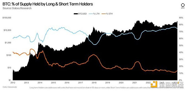 还有许多其他健康指标,感谢@intangiblecoins:https://twitter.com/intangiblecoins 发现并指出这些指标。MVRV(可以理解为所有比特币持有人的综合成本基础)和长期持币者与短期持币者的比率都表明周期处于非常早期阶段。