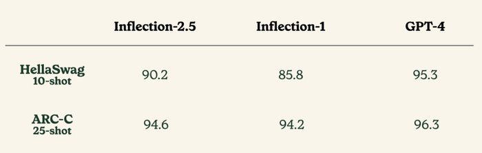 MBPP+和HumanEval+两个编程测试上模型能力也较Inflection-1显著跃升。在HellaSwag和ARC-C代表的常识推理和深度自然语言理解评估中,Inflection-2.5继续进步,给出接近饱和的强劲表现。