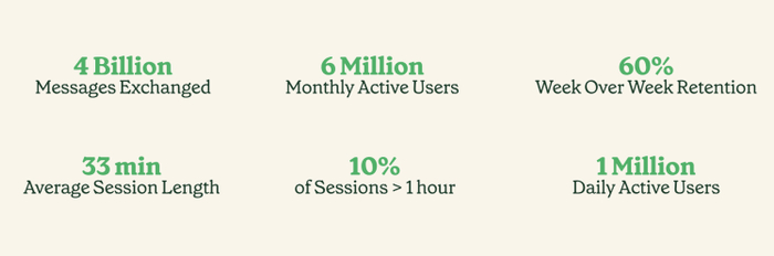 升级后的Pi也在个性化和同理心上做了进一步微调,深受社区欢迎。根据官方数据,目前已经有100万日活跃用户和600万月活跃用户与Pi交换了超过40亿条信息。并且有点牛的是,人们与Pi每天对话的平均持续时间竟达到33分钟之久,十分之一的对话每天持续时长超过1小时。用户粘性上也足以吊打竞争对手,约60%的人在任何一周与Pi交谈后,会在下一周返回。