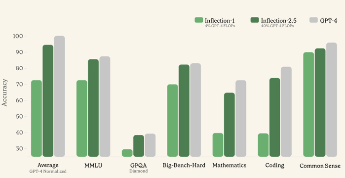 具体来看,初代Inflection-1通过使用GPT-4的4%训练FLOPs,达到了GPT-4性能的72%。而刚发布的Inflection-2.5,仅使用了GPT-4训练FLOPs的40%,就在平均性能上实现显著提升,超过了GPT-4水平的94%,其中STEM(科学、技术、工程、数学)领域的增益最大。