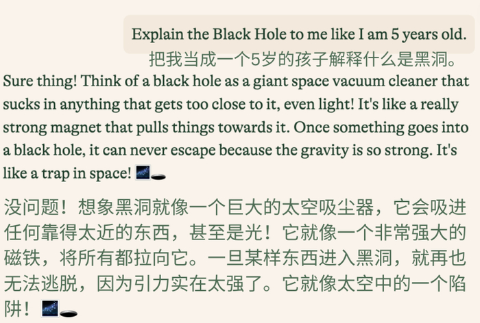 让它向五岁小孩解释高深莫测的宇宙黑洞。深入浅出,比喻贴切,回答得不错。