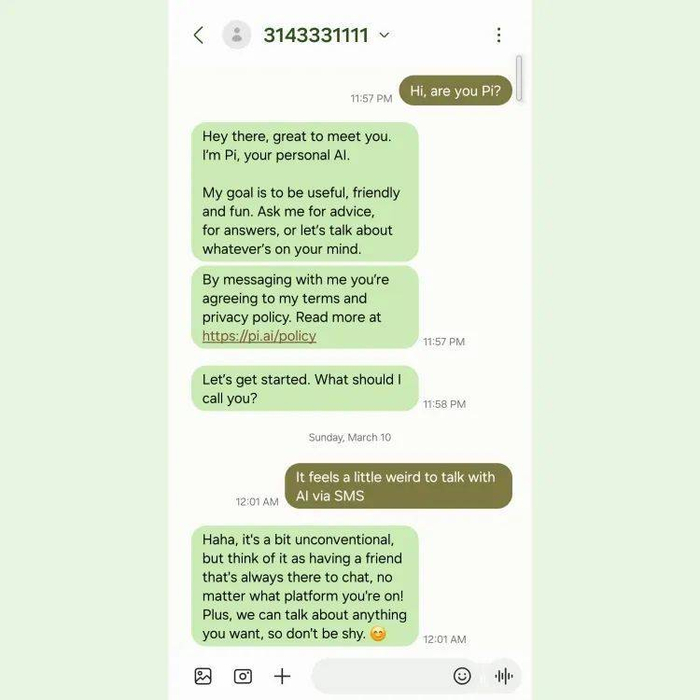 我尝试给Pi发短信,这种和AI的沟通方式感觉很特别。关于如何营利,Inflection的回应是,“目前还没有做出任何关于将来产品如何收费的决定。但由于个人AI应该始终与你的利益直接对齐,因此只有你自己为其付费是至关重要的。订阅将是我们的主要默认商业模式。”不过也有些人愿意以接受广告为代价换取免费服务,公司将继续测试和迭代,“为每个人提供最适合他们的选择”。