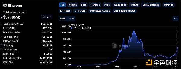 据 DefiLlama 数据显示,当前以太坊网络的TVL约为578.65亿美元,创下自 2022 年5月以来新高。