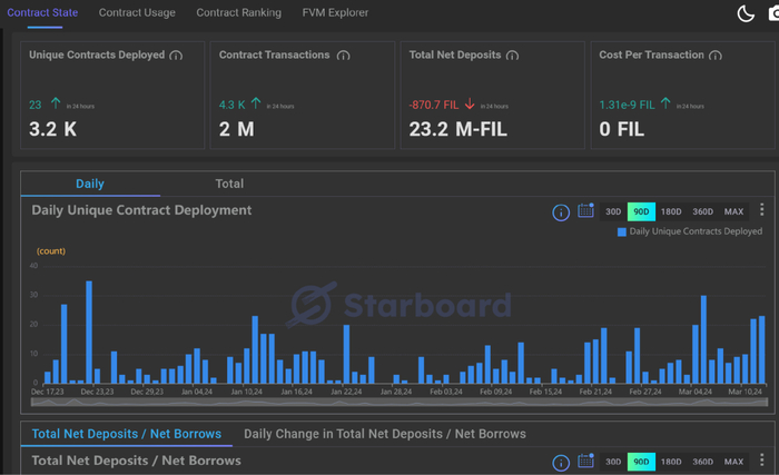 而 Starboard 数据显示,截至 3 月 14 日,已有 3000 多个合约在 FVM 上完成部署,净存款额超 2320 万枚 FIL,尤其是步入 2024 年以来,Uniswap 等相继开始部署到 FVM 之上,Glif、STFIL 等 LSD 协议也让 Filecoin 生态的流动性和 DApp 用例丰富性大幅度改善。