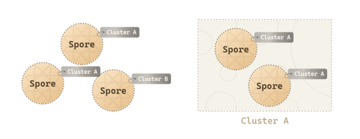 Spore 协议还提出了 Cluster 的概念,即把多个 DOB 归集成一个目录,直接,提高效率。