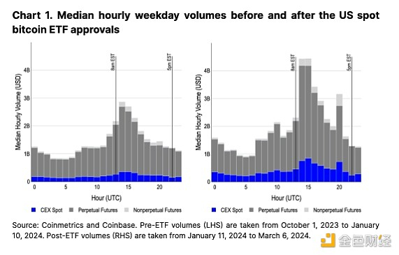 除了能够获得新的机构资金池之外,美国现货比特币 ETF 的第二个影响是美国交易时段 CEX 交易量的集中度增加。 在 ETF 获批之前,交易量峰值已出现在美国东部时间上午 9 点至 10 点的美国市场开盘时间,大约是亚洲和欧洲市场开盘时间的两倍(见图 1)。 然而,在推出现货 ETF 后,美国所有现货、永续期货和非永续期货产品的交易量已升至其他市场时段的近三倍。