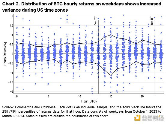 美国比特币流动的主导地位也反映在其价格表现上。 图 2 用蓝色描绘了每小时回报的带状图(显示回报的密度分布),并用黑线划分了第 10 个百分位数和第 90 个百分位数之间的界限。 回报率范围较大的时段与之前成交量图表的时段相对应,表明美国市场早盘时段的高交易量通常会在较大的价格波动中实现。 这表明美国市场早盘时段为日内交易者提供了流动性和波动性方面的最佳机会。