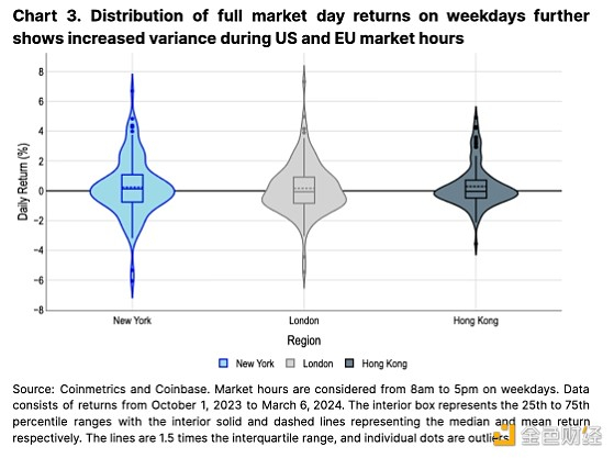 衡量不同金融中心时区的完整市场日回报(从上午 8 点到下午 5 点)也可以更广泛地揭示区域差异。 图 3 的小提琴图显示,纽约和伦敦的营业时间有广泛的回报分布。 (该图显示了使用核密度估计的回报概率,其中“小提琴”的宽度表示获得该回报的概率。)相比之下,香港时段的回报要集中得多。 我们认为这进一步强调了美国(以及一定程度上的欧洲)交易者在推动比特币价格方面的重要性。