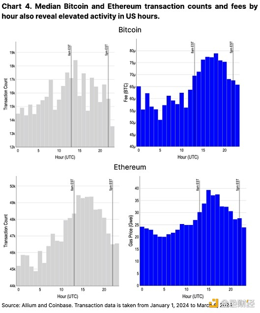 尽管比特币和以太坊具有全球可访问性和去中心化的性质,但它们的活动也在美国时段达到高峰。 美国时段的交易成本较最低点增加了 50% 以上,这证明了这一点(见图 4)。 一方面,我们认为美国时段使用量的增加是由于相对于世界其他地区而言,大量人口精通技术且资本丰富。 与此同时,我们还认为这一活动可能部分是由美国交易员管理各个钱包和交易所的头寸造成的(与这段时间内 CEX 交易量的增加一致)。