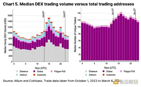 链上 DEX 交易量进一步证实了美国市场时段的高峰活动模式,尽管与 CEX 差异相比差异并不那么明显。 亚洲市场开放时间 (UTC 0) 的 DEX 交易量显着激增,约为美国高峰时段的 70%,而 CEX 的交易量不到美国高峰时段的 30%(见图 5)。 在 ETF 批准之前和之后,这一成交量比率没有发生有意义的变化。